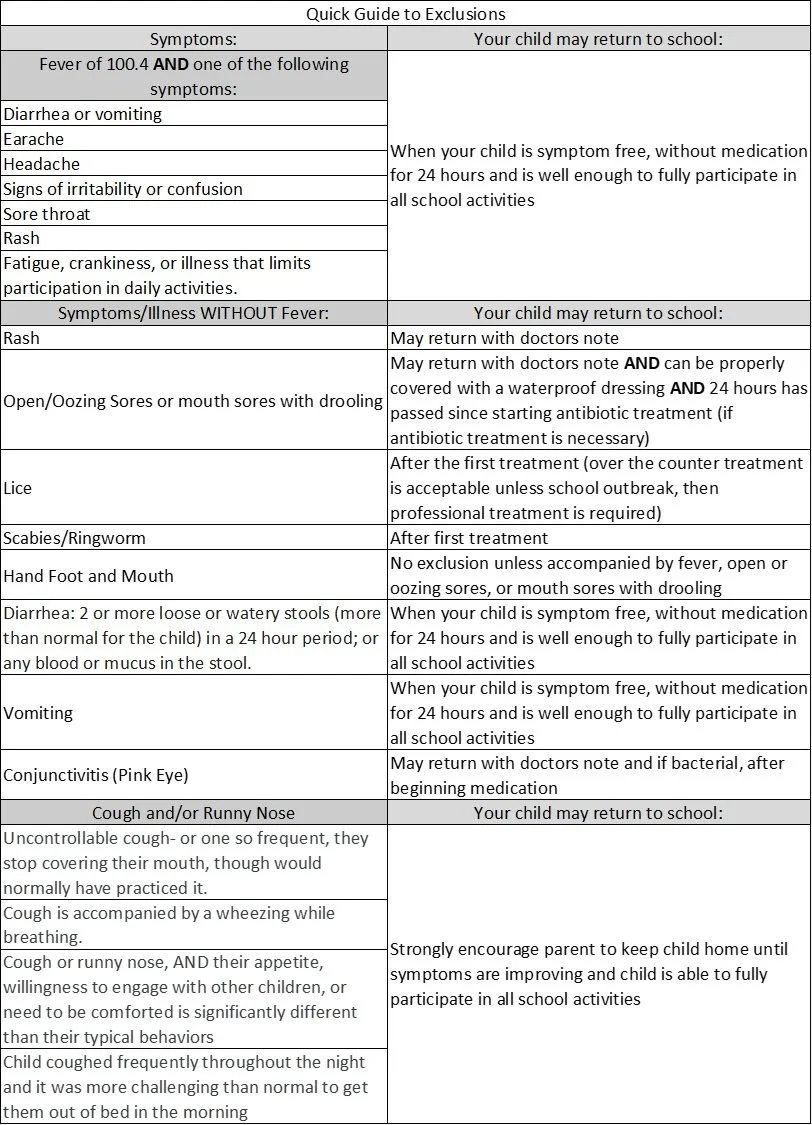 Determination and Notification. To support both staff and families, when a classroom identifies the need for a child to be excluded, the determination will go through a Lead Teacher or member of the school leadership. We know the impact this has on families during a busy work day and will do our due diligence before asking a family member or caregiver to pick up their child. We do ask that you trust our assessment and if you have an issue, please bring it to the school Director's attention. Let's help keep each other as healthy as possible!